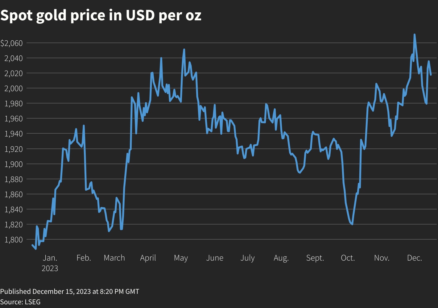 Giá vàng kết thúc tuần trên ngưỡng 2.000 USD, ngưỡng quan trọng về mặt tâm lý. Vàng giao ngay kết thúc ở mức 2.052,69 USD/ounce, cao nhất kể từ ngày 4 tháng 12; trong khi vàng kỳ hạn tháng 2/2024 chốt ở 2.069,1 USD/ounce. Tính chung cả tuần giá tăng 1,7%.