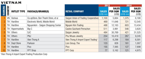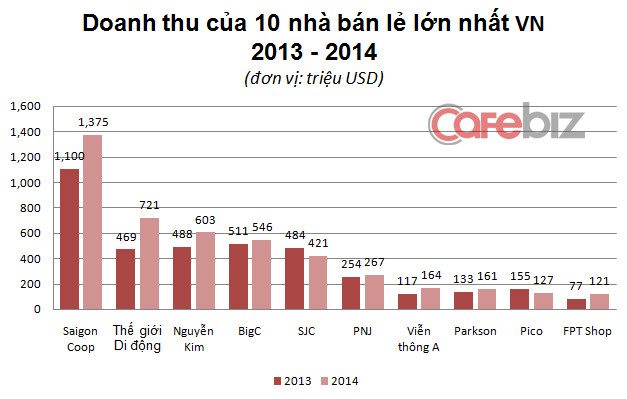 - Theo công bố trên, xét về doanh thu bán hàng, Saigon Coop đứng số 1 với doanh số năm 2014 đạt gần 29.000 tỷ đồng, tương đương 1,375 tỷ USD. Theo sau là Thế giới Di động (721 triệu USD), Nguyễn Kim (603 triệu USD), BigC (546 triệu USD), Công ty TNHH MTV Vàng bạc Đá quý Sài Gòn - SJC (421 triệu USD), PNJ (267 triệu USD)...