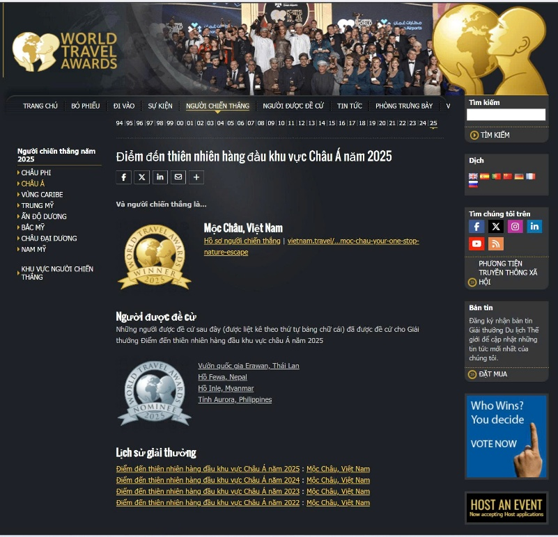 Đồng thời, Mộc Châu còn được quốc tế ghi nhận về giá trị du lịch sinh thái. Tại World Travel Awards 2025, Khu du lịch quốc gia Mộc Châu đã được vinh danh là “Điểm đến thiên nhiên hàng đầu châu Á”. Đây cũng là năm thứ tư liên tiếp (2022–2025) khu vực này nhận được danh hiệu, cho thấy sức hút bền vững và vị thế ngày càng nổi bật trên bản đồ du lịch khu vực.