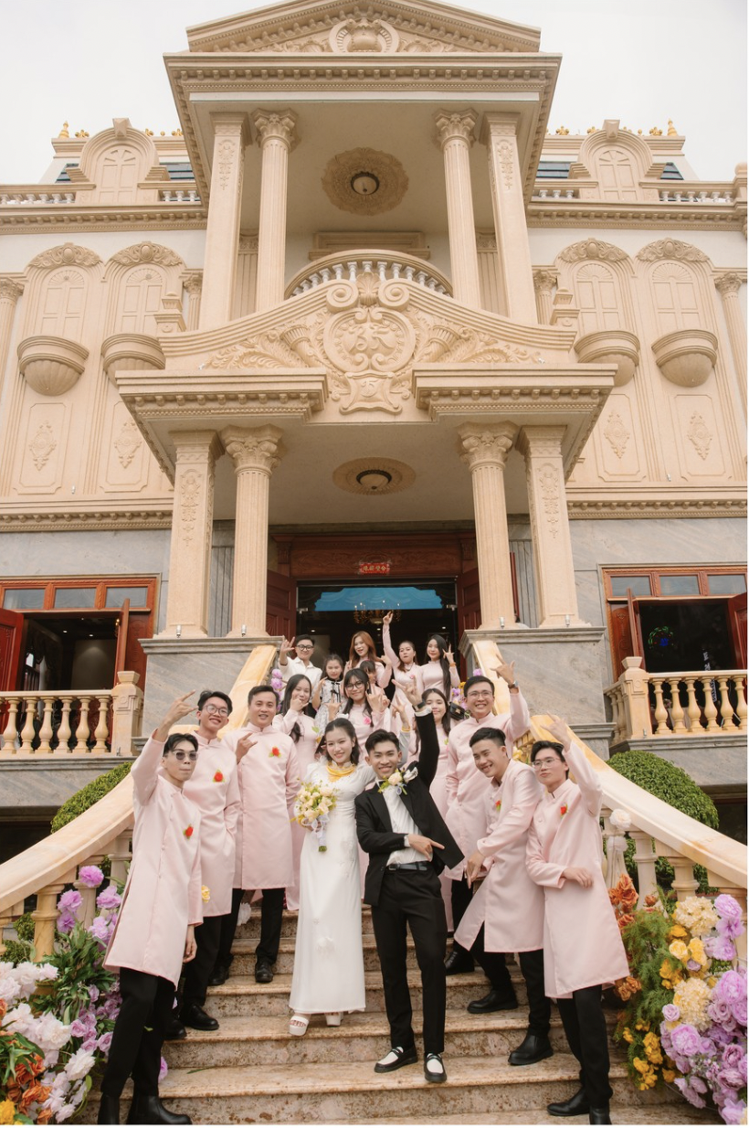 Sự tương phản giữa quy mô bề thế của dinh thự và phong cách trang trí giản dị, tinh tế đã tạo nên nét riêng cho lễ cưới này. Không cần những chi tiết quá cầu kỳ hay phô trương, chỉ với hoa tươi và cách bài trí nhẹ nhàng, toàn bộ không gian vẫn toát lên vẻ sang trọng và tinh tế trong ngày trọng đại của cô dâu chú rể.