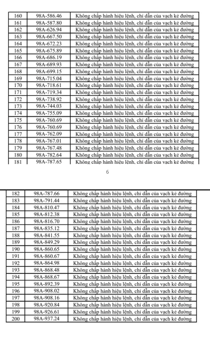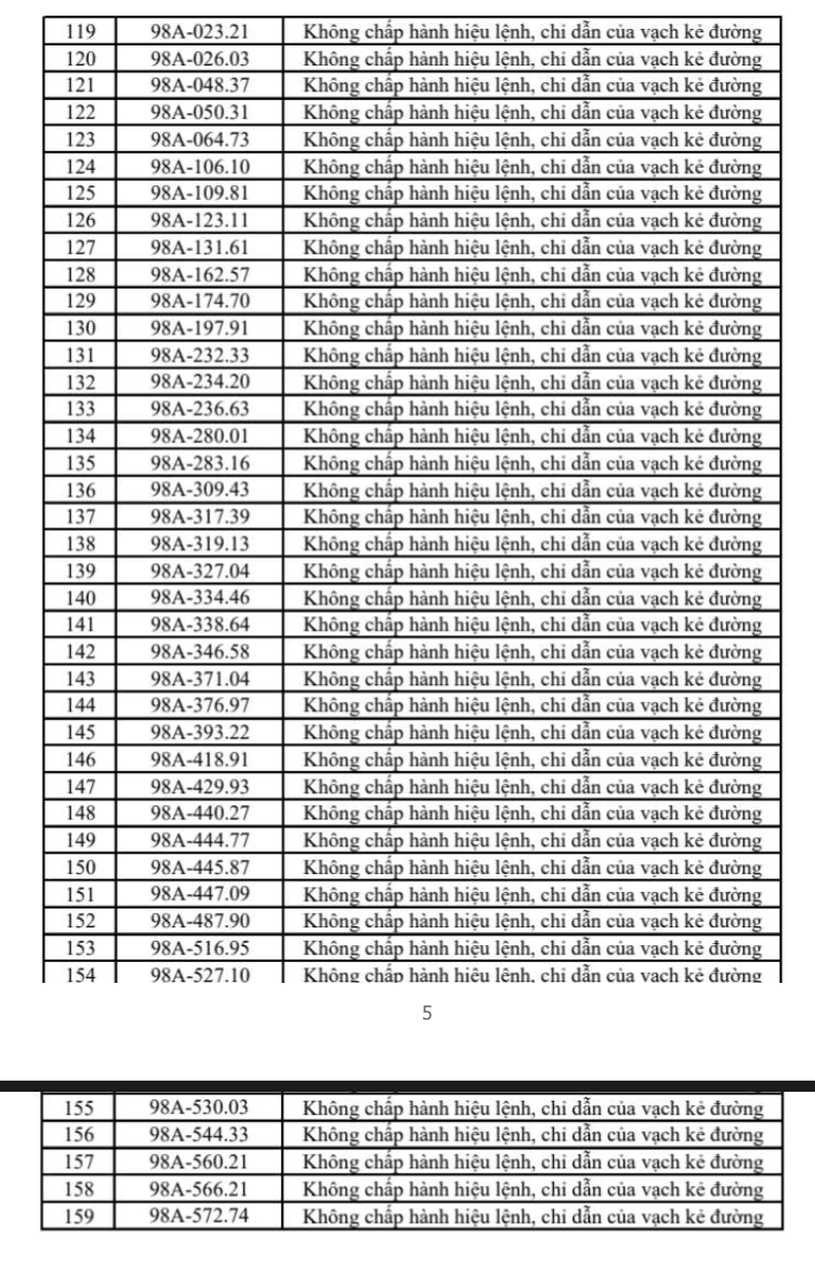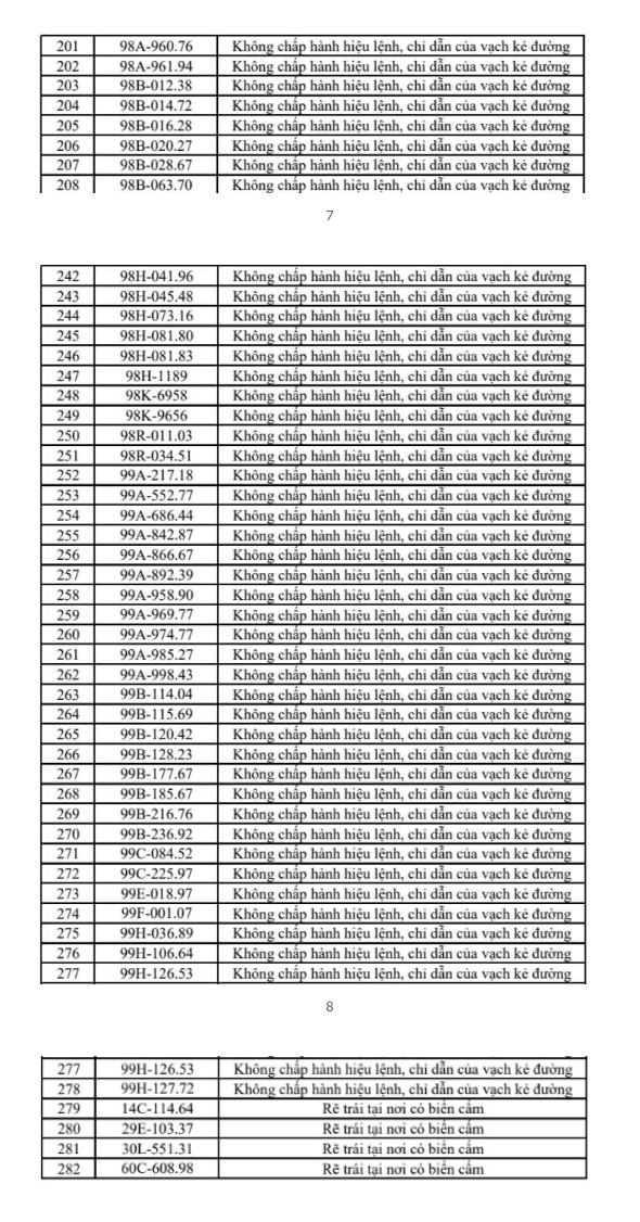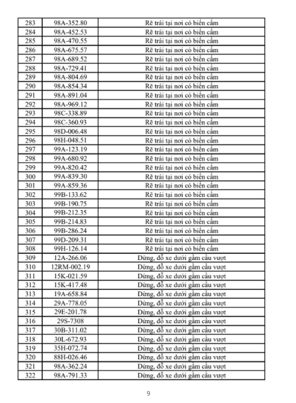 Danh sách chi tiết các phương tiện vi phạm đã được công bố công khai như sau: