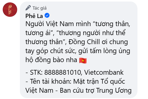 Không chỉ dừng lại ở việc đóng góp tài chính, Phê La lan tỏa tinh thần sẻ chia bằng những lời nhắn đầy xúc động: “Mong Đồng Chill giữ an toàn, mong mọi người bình an và mong bình yên sớm trở lại Việt Nam ta! Chúng mình tin rằng Đất Nước mình, Đồng Bào mình sẽ luôn kiên cường vượt qua khó khăn.”