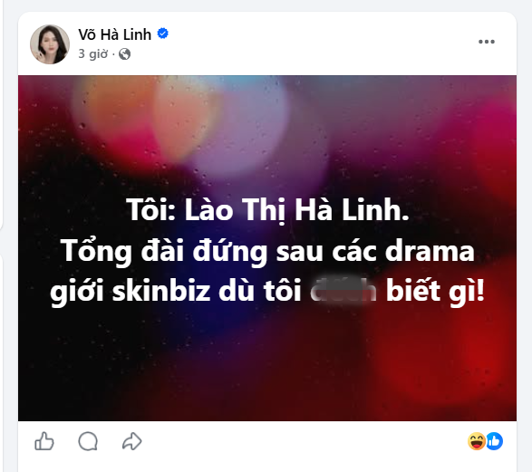 Mới đây, Võ Hà Linh gây chú ý khi đăng tải dòng trạng thái trên trang Facebook chính thức có tích xanh, phủ nhận việc liên quan đến các lùm xùm trong giới kinh doanh mỹ phẩm. Trong bài viết, cô hài hước tự nhận mình là “tổng đài đứng sau các drama skinbiz dù không hề hay biết”.