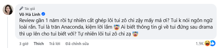 Võ Hà Linh cũng sử dụng lối diễn đạt mang tính châm biếm, khẳng định bản thân “kiệm lời” và không tham gia vào những tranh cãi ồn ào. Đồng thời, cô nhắn nhủ mọi người nếu có thông tin cụ thể liên quan đến việc mình bị cho là “đứng sau drama”, hãy chia sẻ công khai để cô được rõ.