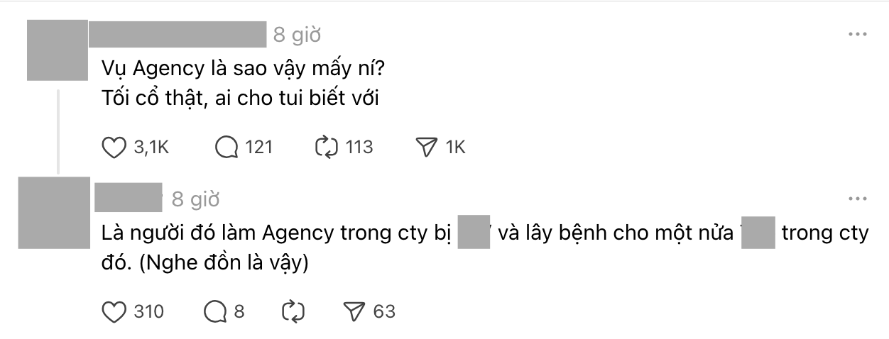Mới đây, MXH Threads lan truyền nhiều tin đồn liên quan đến một TikToker T., được cho là đang làm việc tại một agency có tiếng ở TP.HCM. Theo đó, nhiều thông tin cho rằng T. có nhiều mối quan hệ không lành mạnh, nghi vấn lan truyền bệnh truyền nhiễm và lây lan cho 50% nhân sự trong công ty.