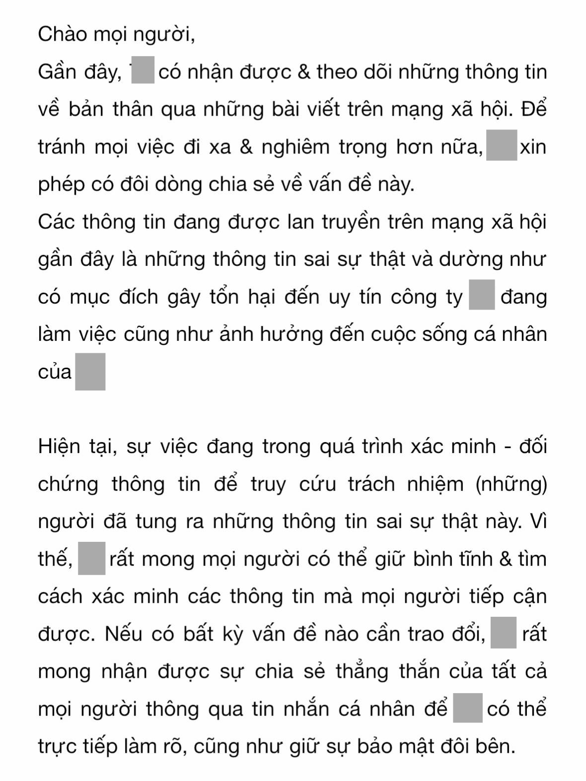 Cụ thể, T. cho biết đã nắm được những thông tin liên quan đến mình trên MXH. Tuy nhiên, T. khẳng định những tin đồn đang lan truyền là sai sự thật và có mục đích gây tổn hại đến uy tín công ty mà anh đang làm việc cũng như ảnh hưởng đến cuộc sống cá nhân của T.