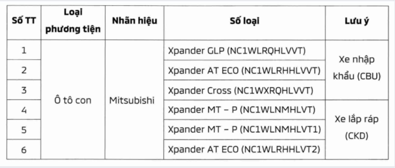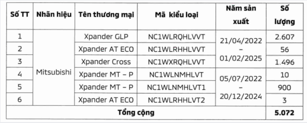 Các mẫu xe thuộc diện thu hồi gồm Mitsubishi Xpander GLP, Xpander AT ECO, Xpander Cross, Xpander MT-P. Trong đó, xe nhập khẩu (CBU) được sản xuất trong giai đoạn từ ngày 21/4/2022 đến ngày 1/2/2025; xe lắp ráp trong nước (CKD) được sản xuất từ ngày 5/7/2022 đến ngày 20/12/2024.