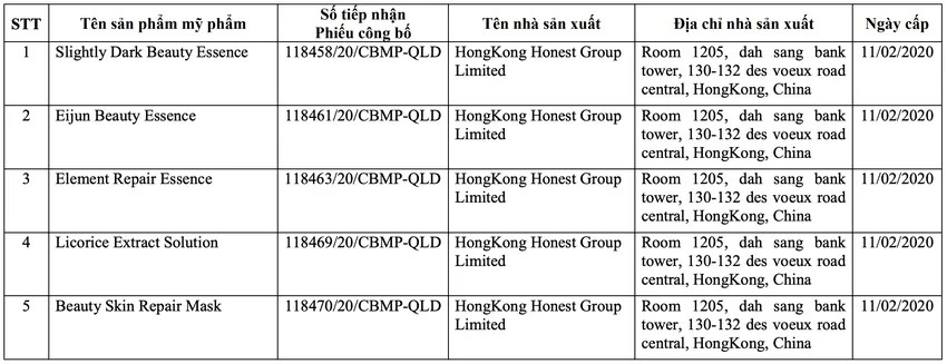 Quyết định công bố hôm 11/8, áp dụng với 5 sản phẩm gồm tinh chất trị nám, phục hồi da, dưỡng da và mặt nạ. Cụ thể là Slightly Dark Beauty Essence, Eijun Beauty Essence, Element Repair Essence, Licorice Extract Solution và Beauty Skin Repair Mask - tất cả đều được cấp phiếu công bố ngày 11/2/2020.