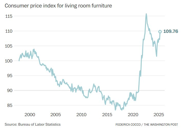 Dù lạm phát do thuế quan thúc đẩy vẫn chưa lan rộng trong toàn nền kinh tế, nhưng theo dữ liệu của chính phủ và khu vực tư nhân cũng như các nhà kinh tế theo dõi chỉ số giá tiêu dùng, giá nội thất và các đồ gia dụng khác đã ghi nhận xu hướng tăng rõ rệt.