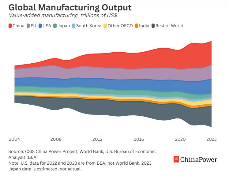 Tờ ChinaPower cho hay năm 2023, Trung Quốc đóng góp khoảng 4,66 nghìn tỷ USD giá trị sản xuất công nghiệp (value-added) cho thế giới, chiếm khoảng 29% tổng toàn cầu, cao hơn nhiều so với mức chỉ 9% năm 2004 và cao hơn 4 nước xếp sau cộng lại là Mỹ, Nhật Bản, Đức và Ấn Độ.