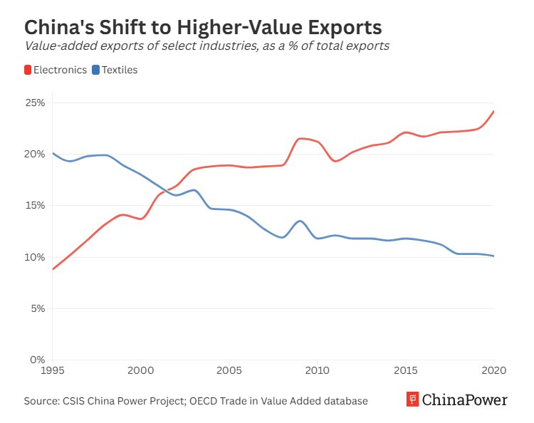 Nền kinh tế số 1 Châu Á cũng tăng cường xuất khẩu công nghệ, giảm dần các mặt hàng kỹ thuật thấp như may mặc.