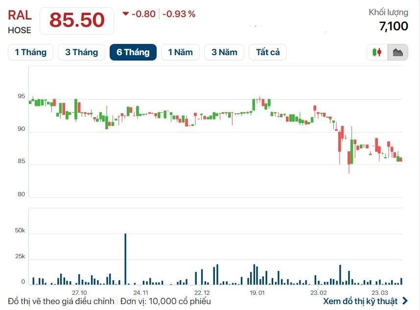 Trên thị trường chứng khoán, cổ phiếu RAL hiện đang giao dịch quanh mức 85.500 đồng/cổ phiếu.