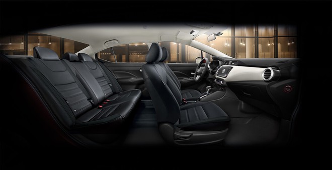 Về nội thất, Nissan Almera sở hữu vô lăng thể thao D-cut. Almera cũng không được trang bị bệ để tay trung tâm ở hàng ghế trước và hàng ghế sau. Tựa đầu 3 vị trí trên hàng ghế sau thiết kế dạng liền khối cố định. Màn hình cảm ứng trung tâm 8 inch có hỗ trợ Apple CarPlay/Android Auto, bảng đồng hồ tích hợp màn hình màu 7 inch. e hỗ trợ đầy đủ kết nối Radio, AM/FM, USB, AUX… Hệ thống âm thanh 6 loa, điều hòa tự động một vùng, khởi động nút bấm và cổng sạc USB/12V. Khoang hành lý Nissan Almera với dung tích 490 lít.