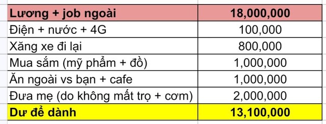 Tận dụng lợi thế không phải thuê nhà, và được gia đình hỗ trợ nhưng cũng không thể phủ nhận nỗ lực tiết kiệm của cô gái này. Dù mới ra trường đi làm chưa lâu, cô đã để dành được 1 cây vàng và 70 triệu tiền mặt. Hàng tháng chi tiêu chỉ 5 triệu quay đầu, với mức thu nhập 18 triệu, cô tiết kiệm được 13,1 triệu/tháng.