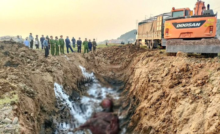 Lực lượng chức năng tỉnh Bắc Ninh tiêu hủy 13 con trâu mắc bệnh lở mồm long móng. (Ảnh: Công an Bắc Ninh).