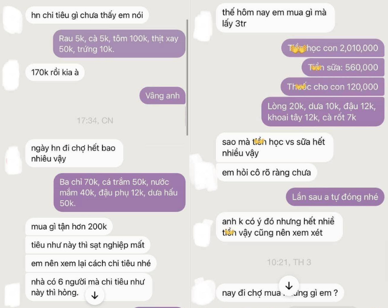 Từ đoạn tin nhắn, có thể thấy gia đình cô hiện có 6 thành viên, vậy mà tiền đi chợ không được quá 200.000 đồng/ngày, điều này khiến mọi người không thể không đặt câu hỏi. Chưa kể, đến cả tiền đóng học, tiền mua sữa cho con, anh chồng này cũng truy hỏi tới cùng.