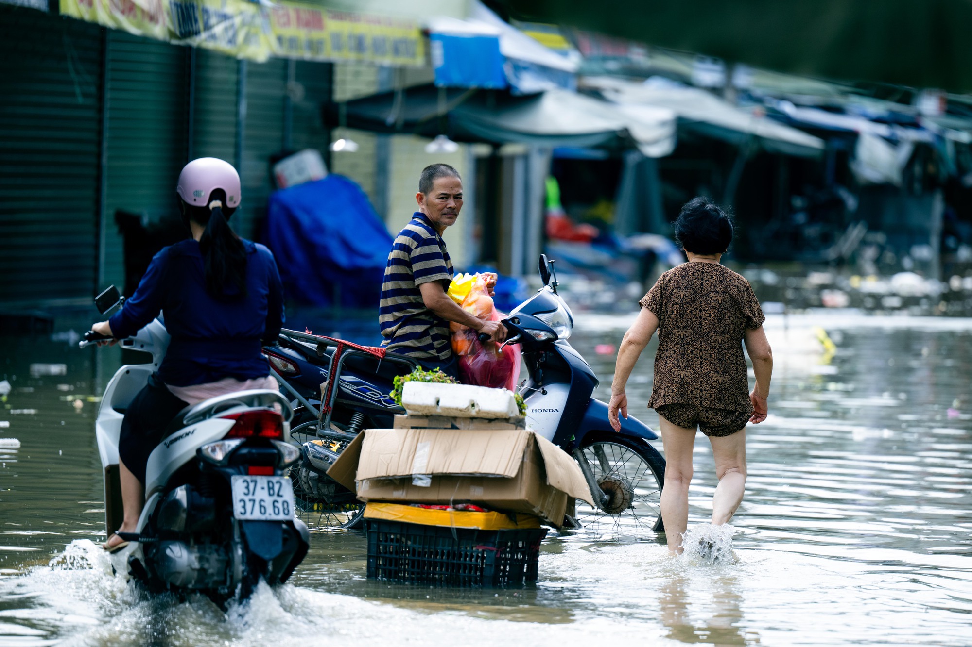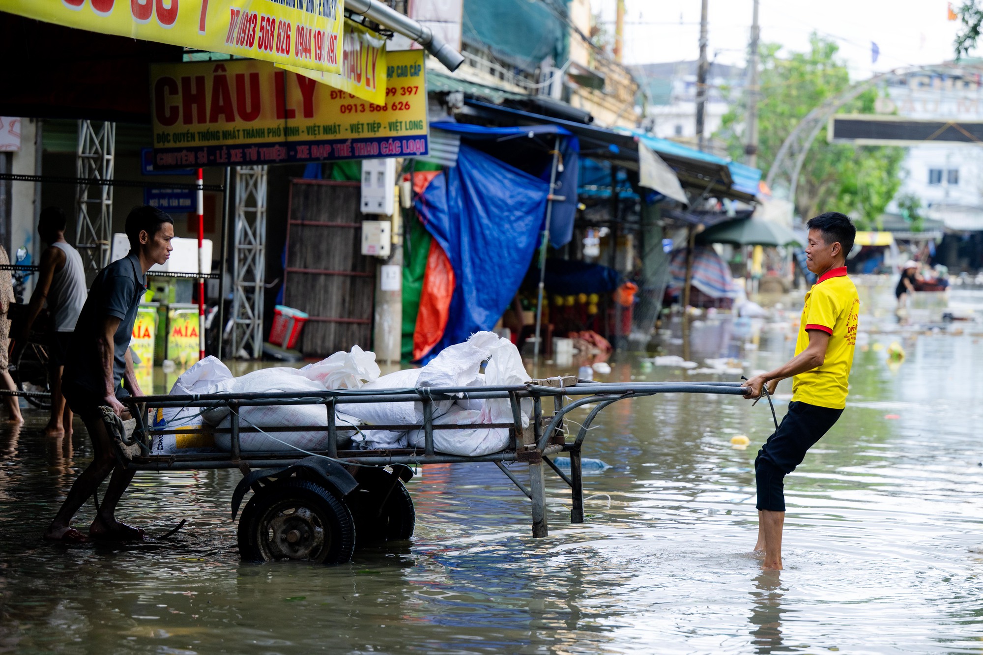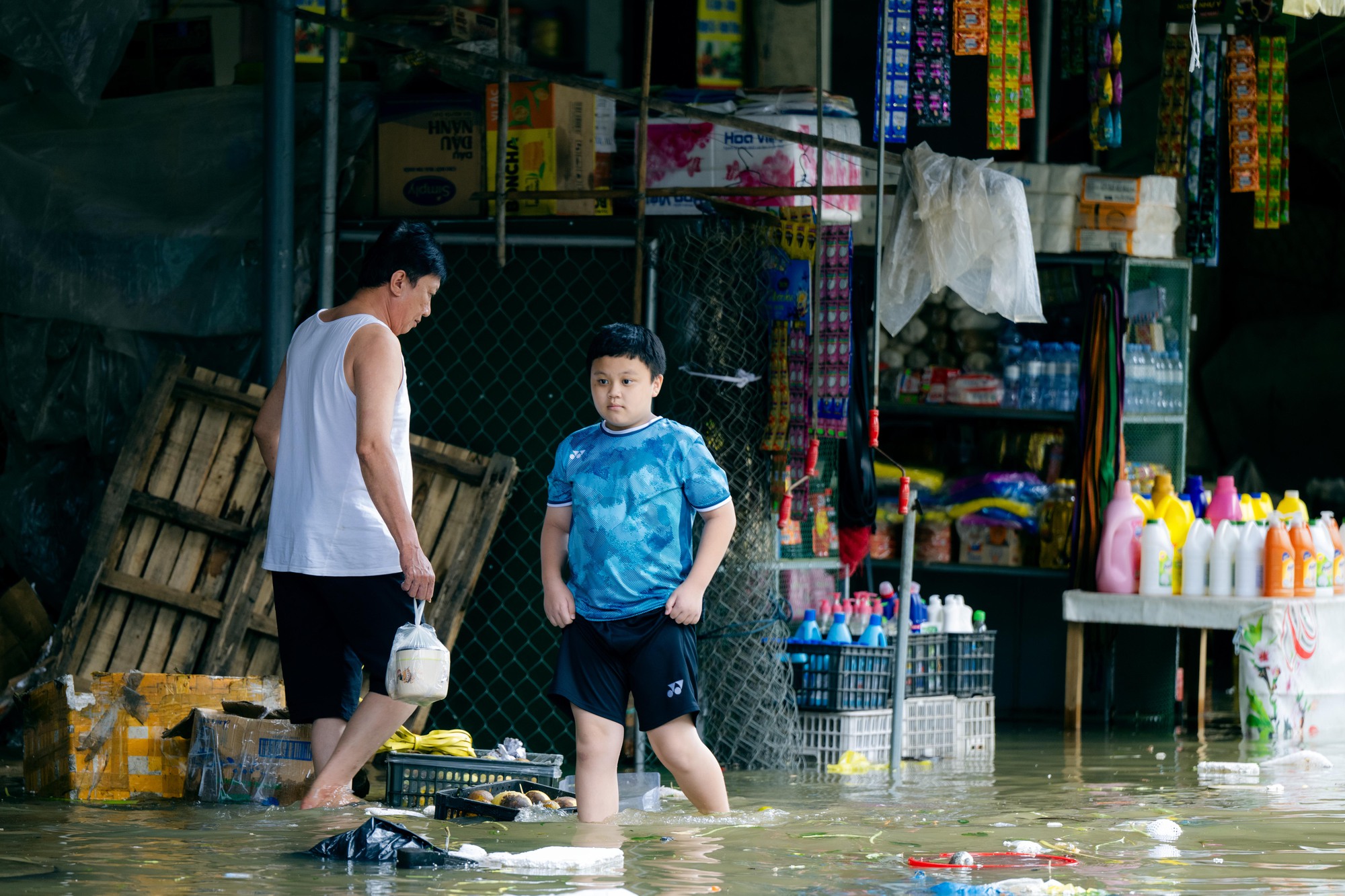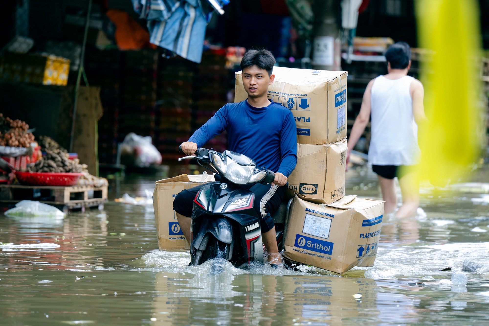 “Nước ngập khắp nơi, đi lại khó khăn lắm, nguy hiểm cũng nhiều. Nhưng nếu không đi làm thì lấy gì mà ăn, lấy gì lo cho con cái,” một người đàn ông đang gồng mình vận chuyển những thùng hàng nặng trĩu giữa dòng nước lũ vừa nói vừa cắn chặt răng