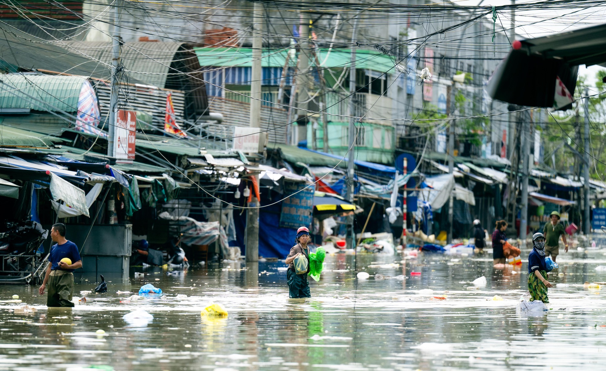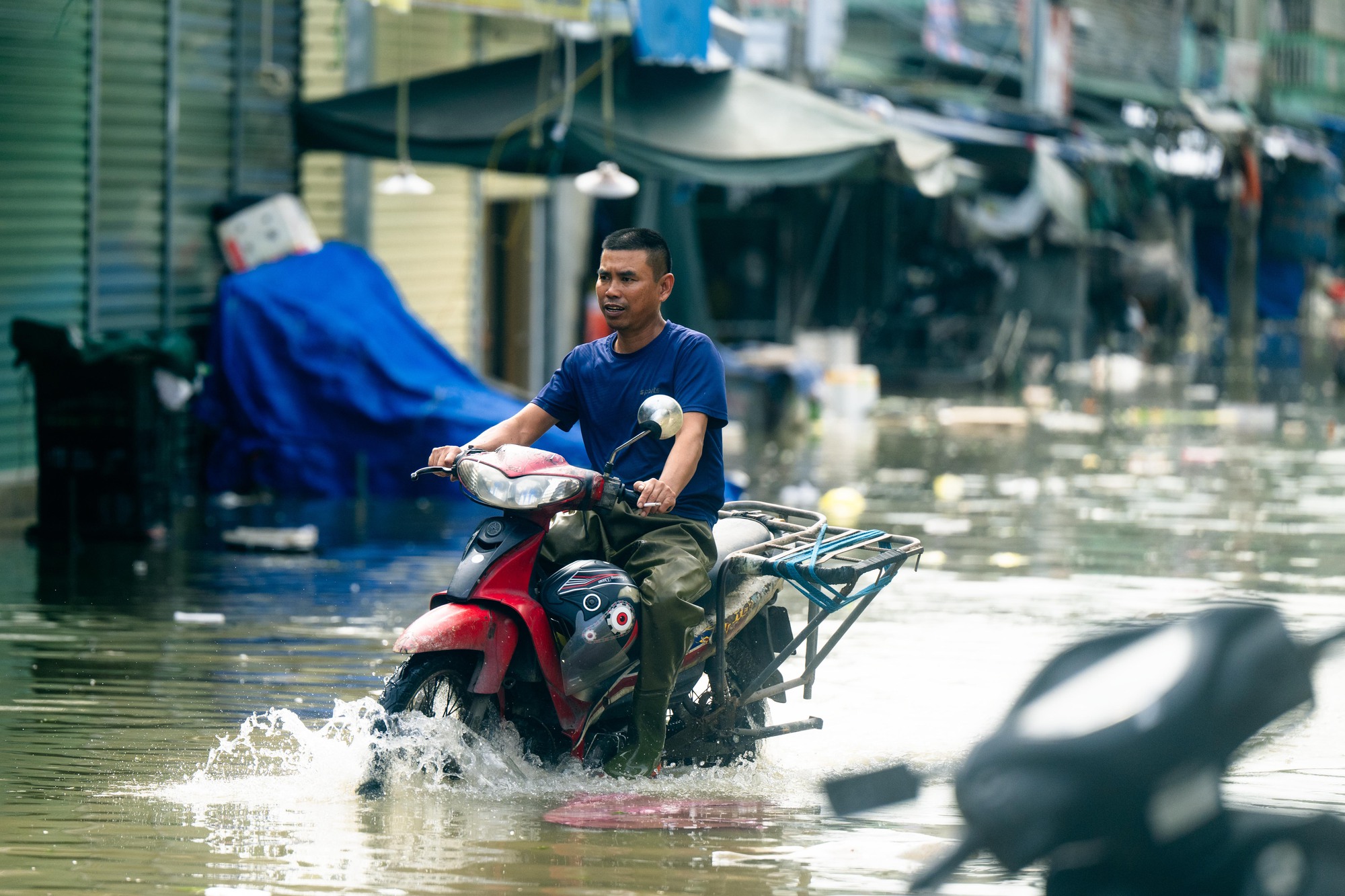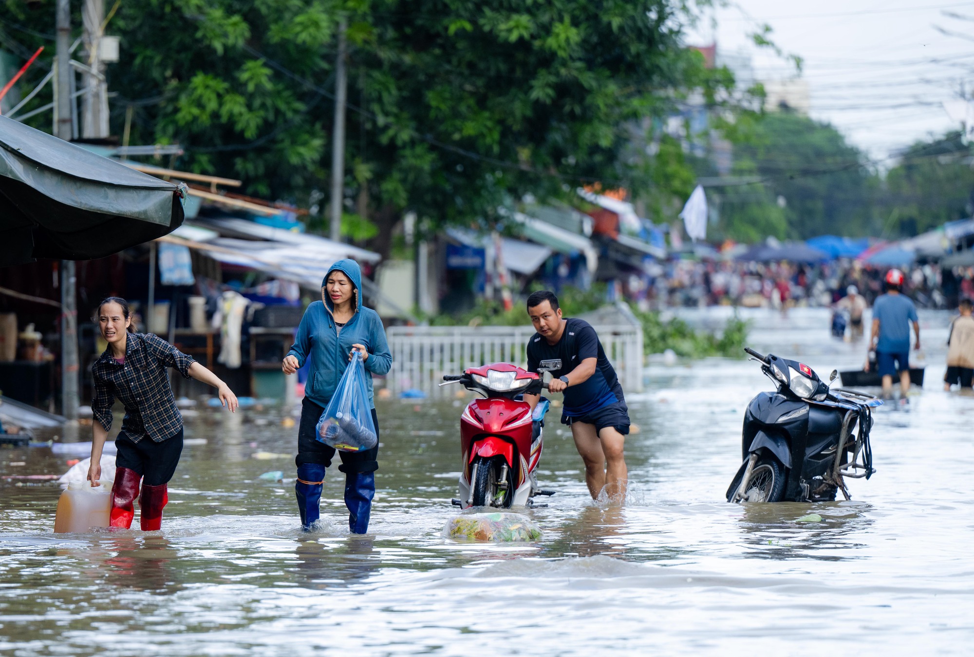 “Nước ngập khắp nơi, đi lại khó khăn lắm, nguy hiểm cũng nhiều. Nhưng nếu không đi làm thì lấy gì mà ăn, lấy gì lo cho con cái,” một người đàn ông đang gồng mình vận chuyển những thùng hàng nặng trĩu giữa dòng nước lũ vừa nói vừa cắn chặt răng