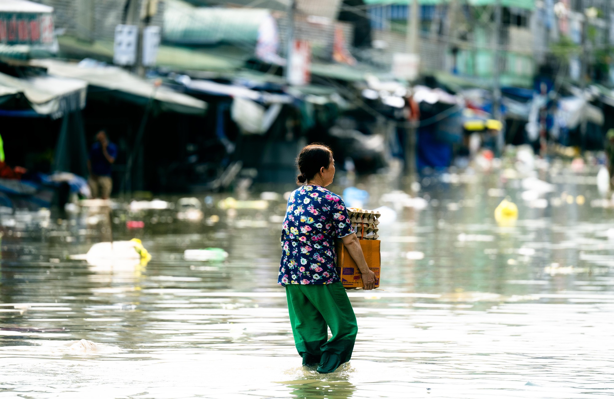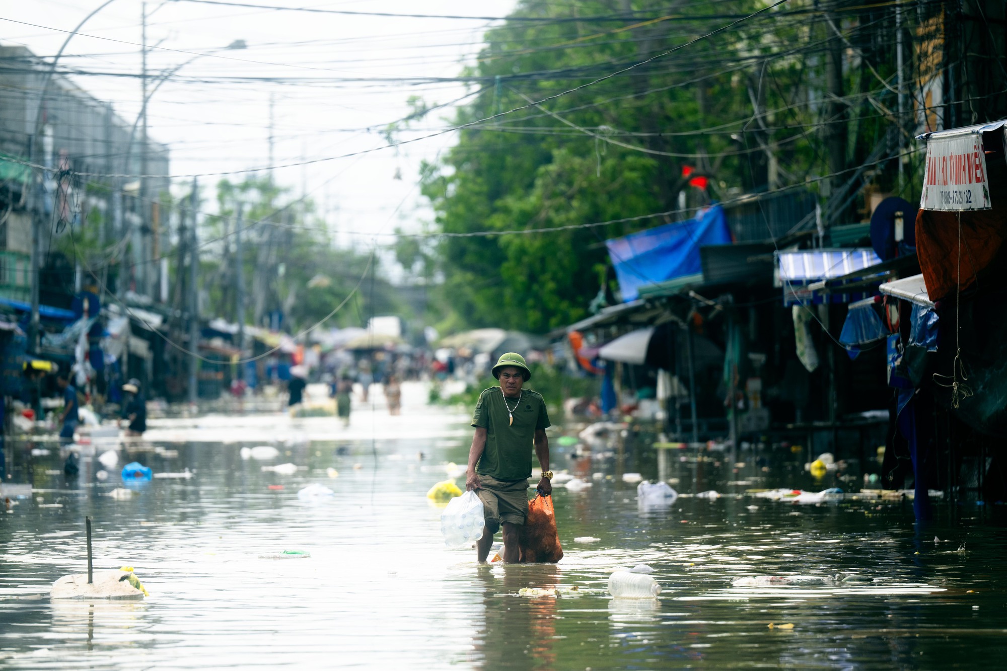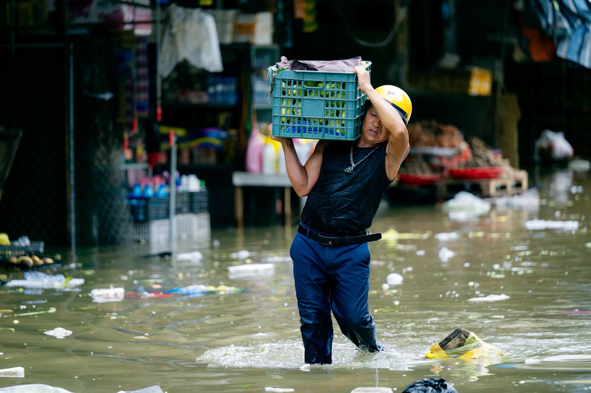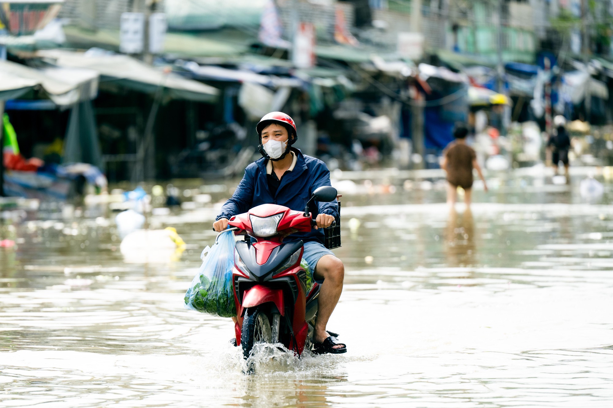 “Nước ngập khắp nơi, đi lại khó khăn lắm, nguy hiểm cũng nhiều. Nhưng nếu không đi làm thì lấy gì mà ăn, lấy gì lo cho con cái,” một người đàn ông đang gồng mình vận chuyển những thùng hàng nặng trĩu giữa dòng nước lũ vừa nói vừa cắn chặt răng