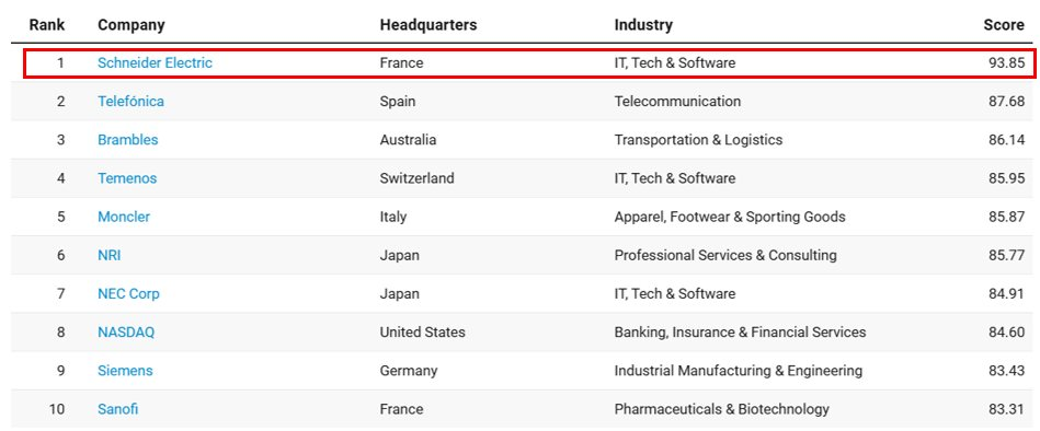 Schneider Electric cũng đã được Corporate Knights vinh danh là Tập đoàn Bền vững Nhất Thế Giới năm 2025 và là công ty duy nhất hai lần đứng đầu danh sách Global 100 của Corporate Knights. Tập đoàn đến từ Pháp này cũng đã được Corporate Knights công nhận là Tập đoàn Bền vững nhất tại Châu Âu và tại chính quốc gia Pháp.