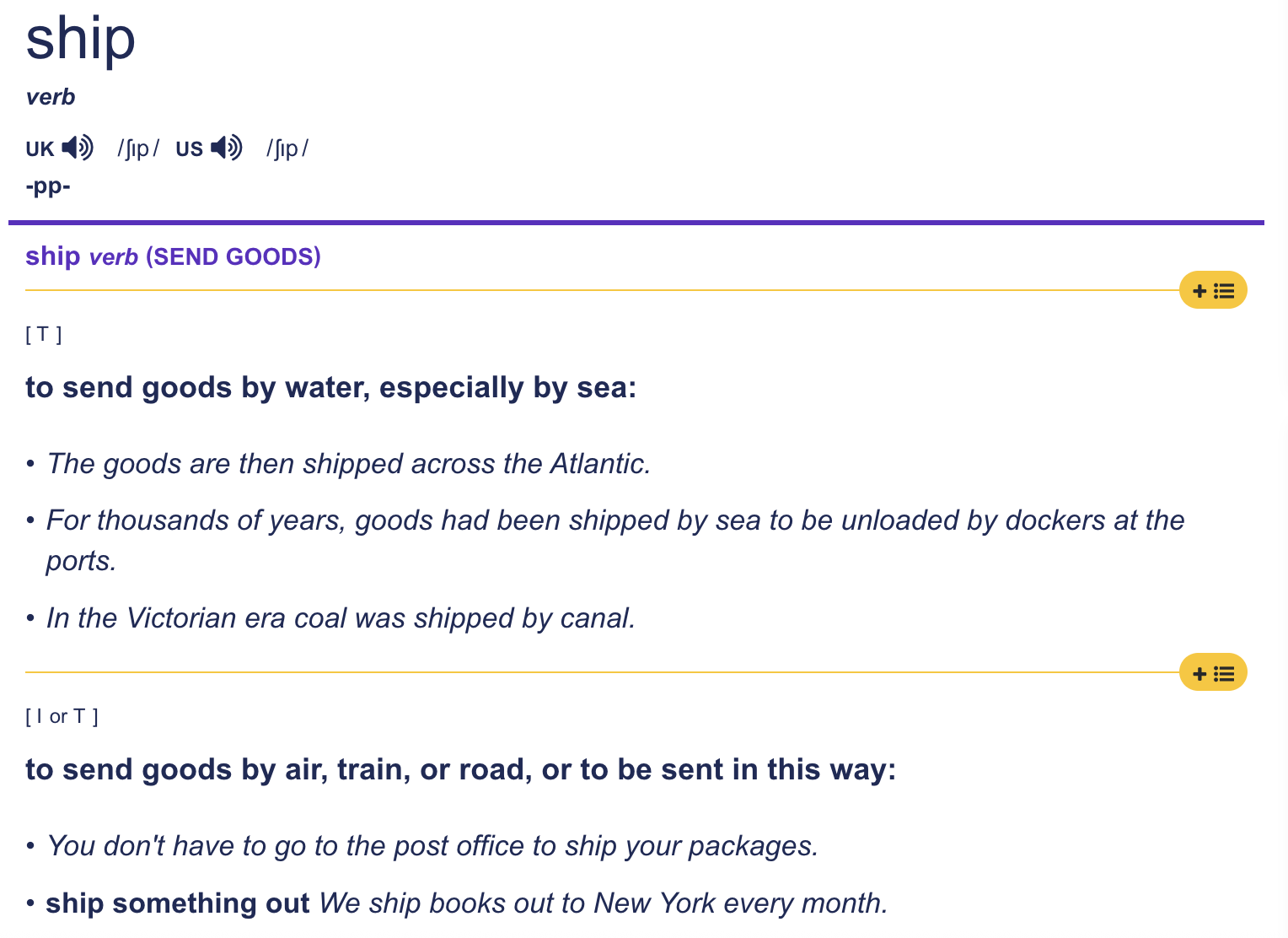Theo cách giải thích từ các tài liệu ngôn ngữ học và từ điển Cambridge, “ship” vốn là một danh từ chỉ những con thuyền lớn, tàu biển. Khi được dùng như động từ, “ship” mang nghĩa gửi hoặc chuyên chở hàng hóa, con người bằng đường biển, hoặc vận chuyển với số lượng lớn trên những quãng đường xa, thường là giữa các khu vực hoặc quốc gia.