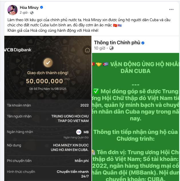 Nữ ca sĩ chia sẻ, "Làm theo lời kêu gọi của chính phủ nước ta, Hoà Minzy xin được ủng hộ người dân Cuba và cầu chúc cho đất nước Cuba luôn bình an, đủ đầy cơm ăn áo mặc. Khán giả của Hoà cũng cùng hành động với Hoà nhé!".