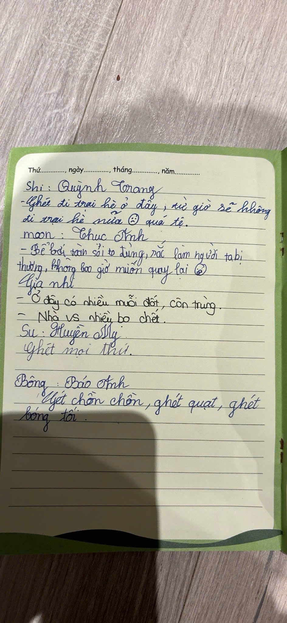 Đây là trích đoạn nhật ký của một nhóm 6 bạn nhỏ được các mẹ cho đi trại hè từ ngày 13 - 16/6/2025 “Ghét đi trại hè ở đây, từ giờ sẽ không đi trại hè nữa. Quá tệ”, “Bể bơi toàn sỏi to đùng, sắc làm người ta bị thương, không bao giờ muốn quay lại”, “Ở đây có nhiều muỗi đốt, côn trùng. Nhà vệ sinh nhiều bọ chét”,...