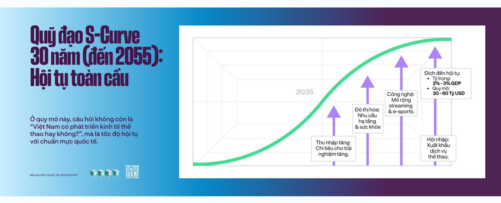 "Chân chữ S" - như trong bài trình bày của ông Trương Trí Vĩnh (tác giả báo cáo) tại diễn đàn - là giai đoạn tích lũy: Nơi tăng trưởng chưa bùng nổ, nhưng các điều kiện nền tảng đang dần hình thành. Trong trường hợp của Việt Nam, điều đó đồng nghĩa với một thực tế: Kinh tế thể thao vẫn chưa trở thành một ngành đúng nghĩa.