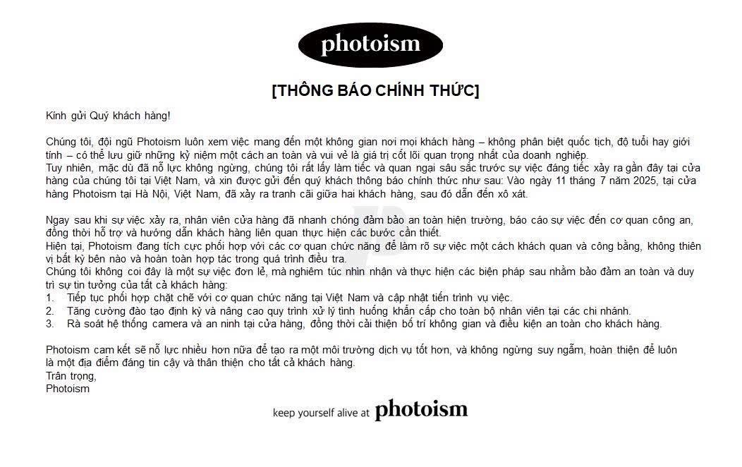 Theo đó phía Photoism bày tỏ sự quan ngại sâu sắc về vụ việc xảy ra ngày 11/7/2025 tại cửa hàng ở Hà Nội, khi một cuộc tranh cãi giữa hai khách hàng dẫn đến xô xát. Phía tiệm photobooth khẳng định nhân viên đã nhanh chóng xử lý, báo lực lượng chức năng và hỗ trợ các bên liên quan.