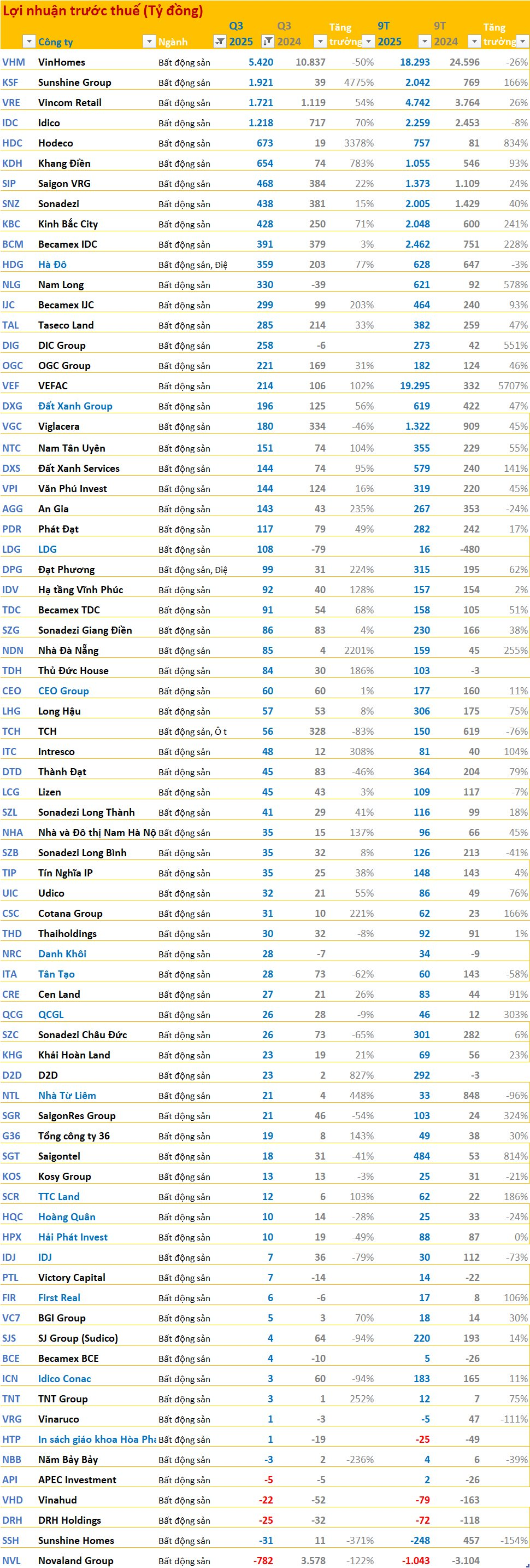 Phần lớn doanh nghiệp bất động sản tăng mạnh trong quý này. Nhiều doanh nghiệp có mức tăng trưởng cao như Sunshine Group (4.775%), Hodeco (3.378%), Nhà Đà Nẵng (2.201%), ....