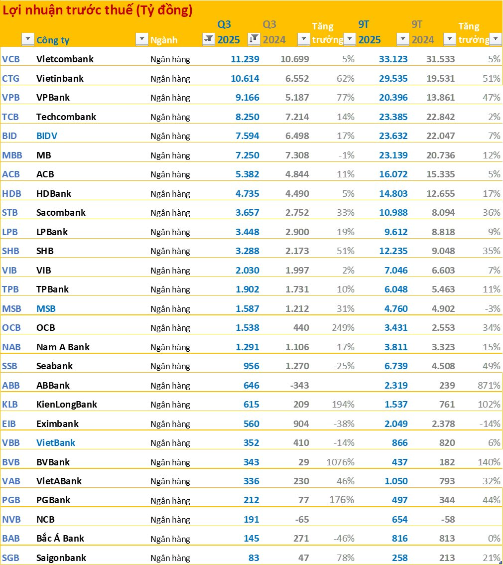 Nhóm ngân hàng chiếm tới 8 trong 10 doanh nghiệp có lợi nhuận trước thuế cao nhất quý 3/2025.