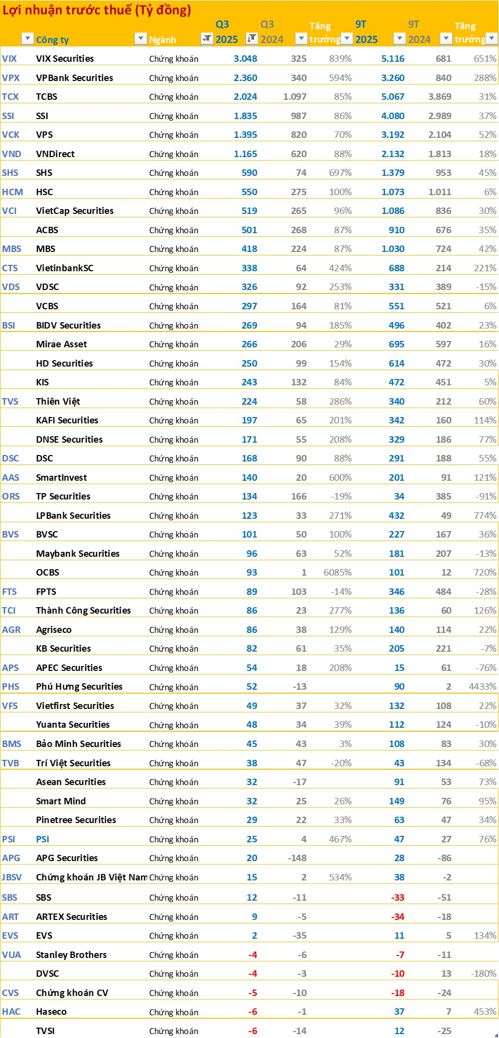 Nếu như quý 3/2024 ngành chứng khoán chỉ có TCBS có mức LNTT trên 1.000 tỷ đồng thì quý 3/2025 có tới 6 công ty có LNTT trên 1.000 tỷ là VIX, VPBankS, TCBS, SSI, VPS, VNDirect. Hàng loạt công ty trong ngành tăng trưởng hàng trăm phần trăm.