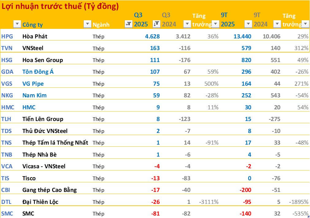 Kết quả kinh doanh ngành thép có sự cải thiện trong quý này. LNTT Hòa Phát tăng 36%; VNSteel, Hoa Sen, Tiến Lên Group có lãi trong khi cùng kỳ lỗ trăm tỷ; VG Pipe tăng trưởng tới 500%.