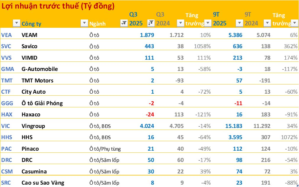 Ngành ô tô quý này phân hóa mạnh khi có những công ty tăng trưởng cao như Savico (1.058%), VIMID (111%) nhưng Haxaco lại báo lỗ 24 tỷ đồng, City Auto giảm 72%, HHS giảm 64%...