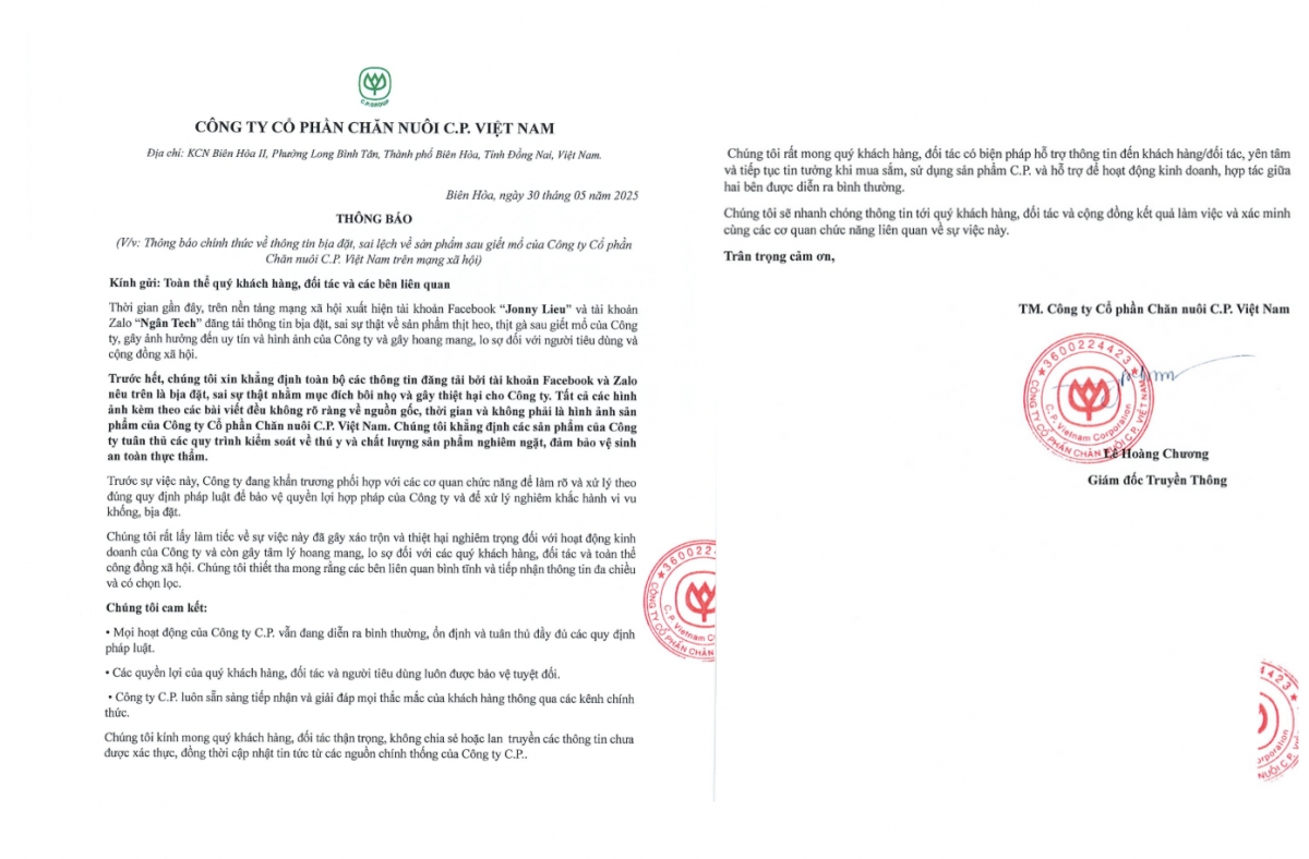 “Thời gian gần đây, trên nền tảng mạng xã hội xuất hiện tài khoản Facebook “J.L” và tài khoản Zalo “N.T.” đăng tải thông tin bịa đặt, sai sự thật về sản phẩm thịt heo, thịt gà sau giết mổ của Công ty, gây ảnh hưởng đến uy tín và hình ảnh của Công ty và gây hoang mang, lo sợ đối với người tiêu dùng và cộng đồng xã hội.