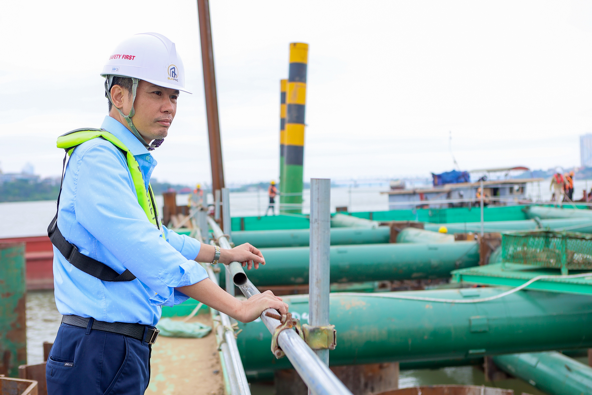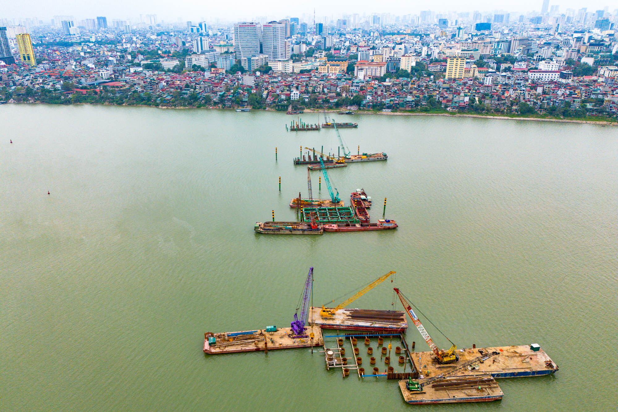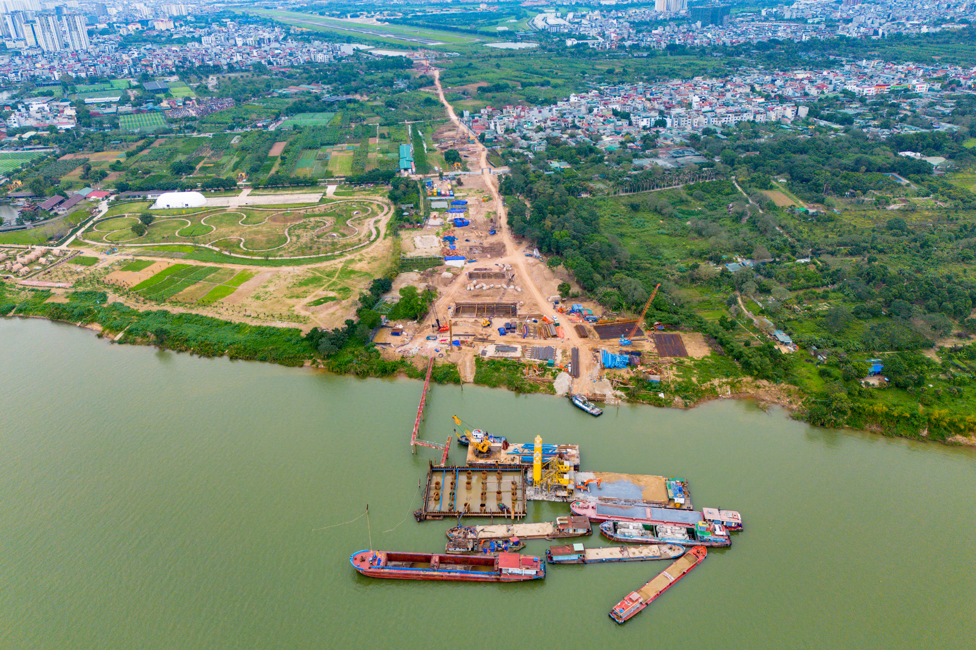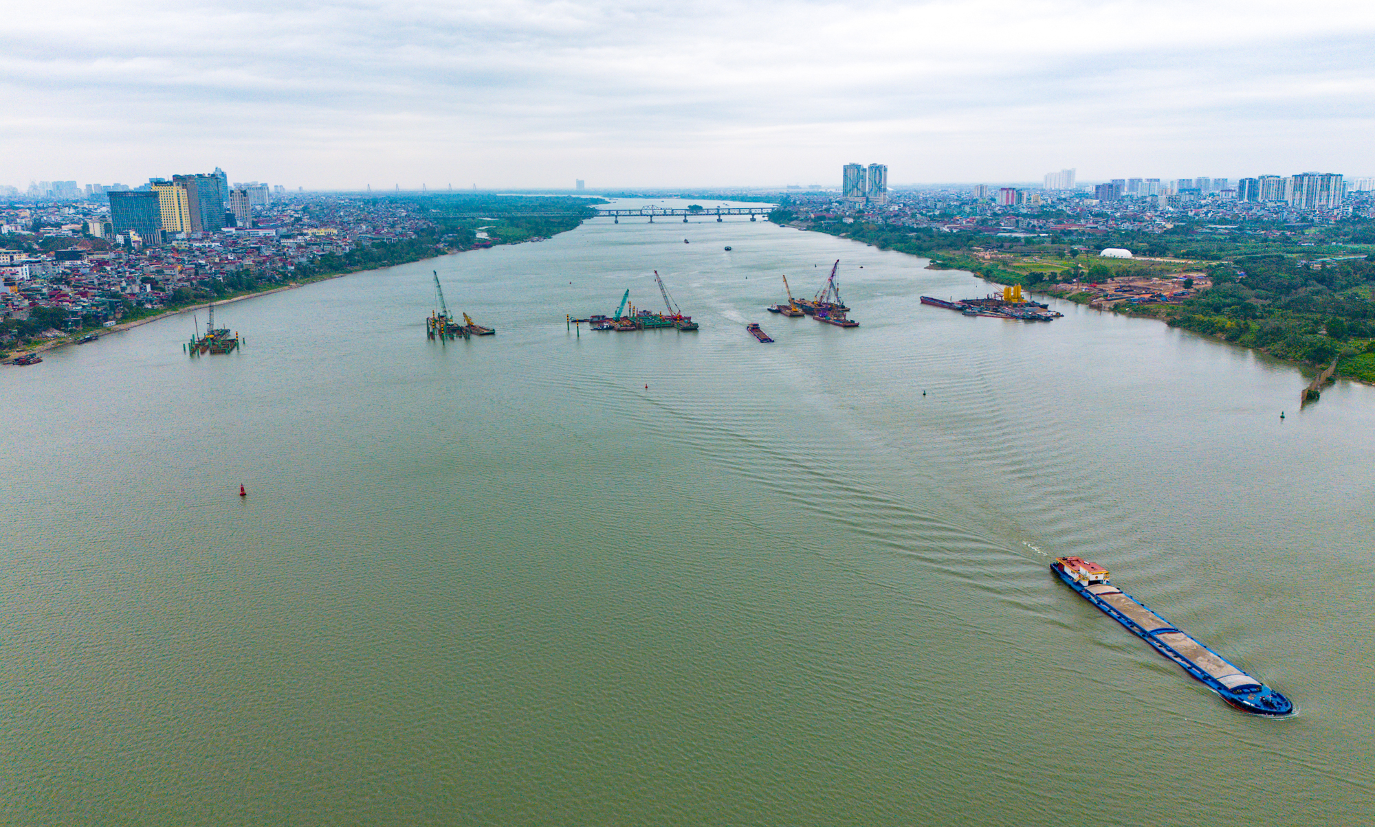 Toàn cảnh công trường xây cầu hơn 16.000 tỷ của Sun Group ở Hà Nội: Máy móc phủ kín mặt sông, phấn đấu hoàn thành nhanh nhất Việt Nam
