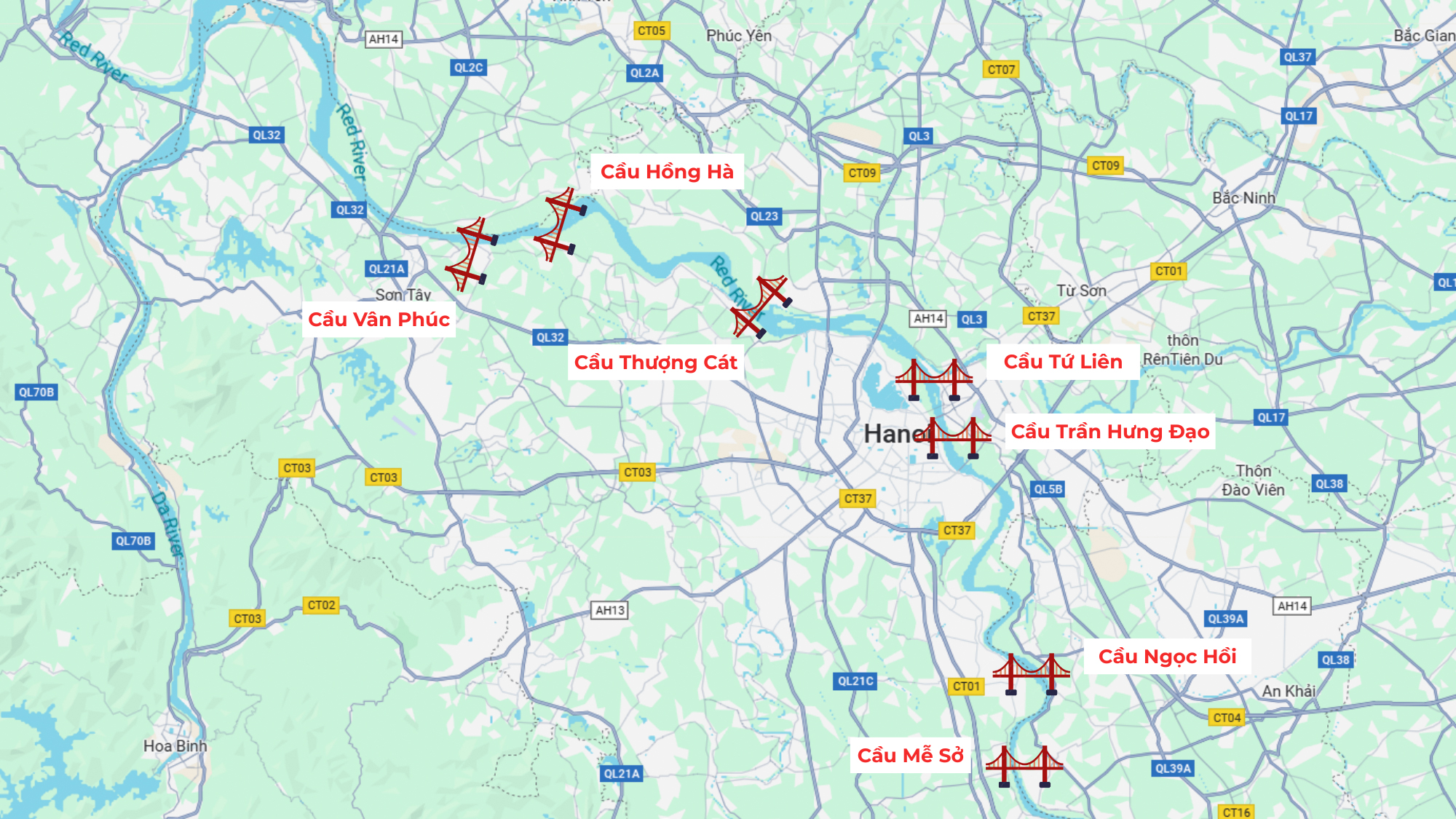 Hạng mục cầu chính của dự án có chiều dài 870 m với 6 nhịp vòm thép, tạo hình biểu tượng vô cực – phương án kiến trúc được kỳ vọng trở thành dấu ấn mới trên sông Hồng. Hai đoạn cầu dẫn dài hơn 1,2 km sử dụng kết cấu dầm hộp và dầm bản bê tông cốt thép dự ứng lực. Toàn tuyến bố trí 3 nút giao, vừa tăng năng lực thông hành, vừa tái cấu trúc dòng giao thông khu vực nội đô.