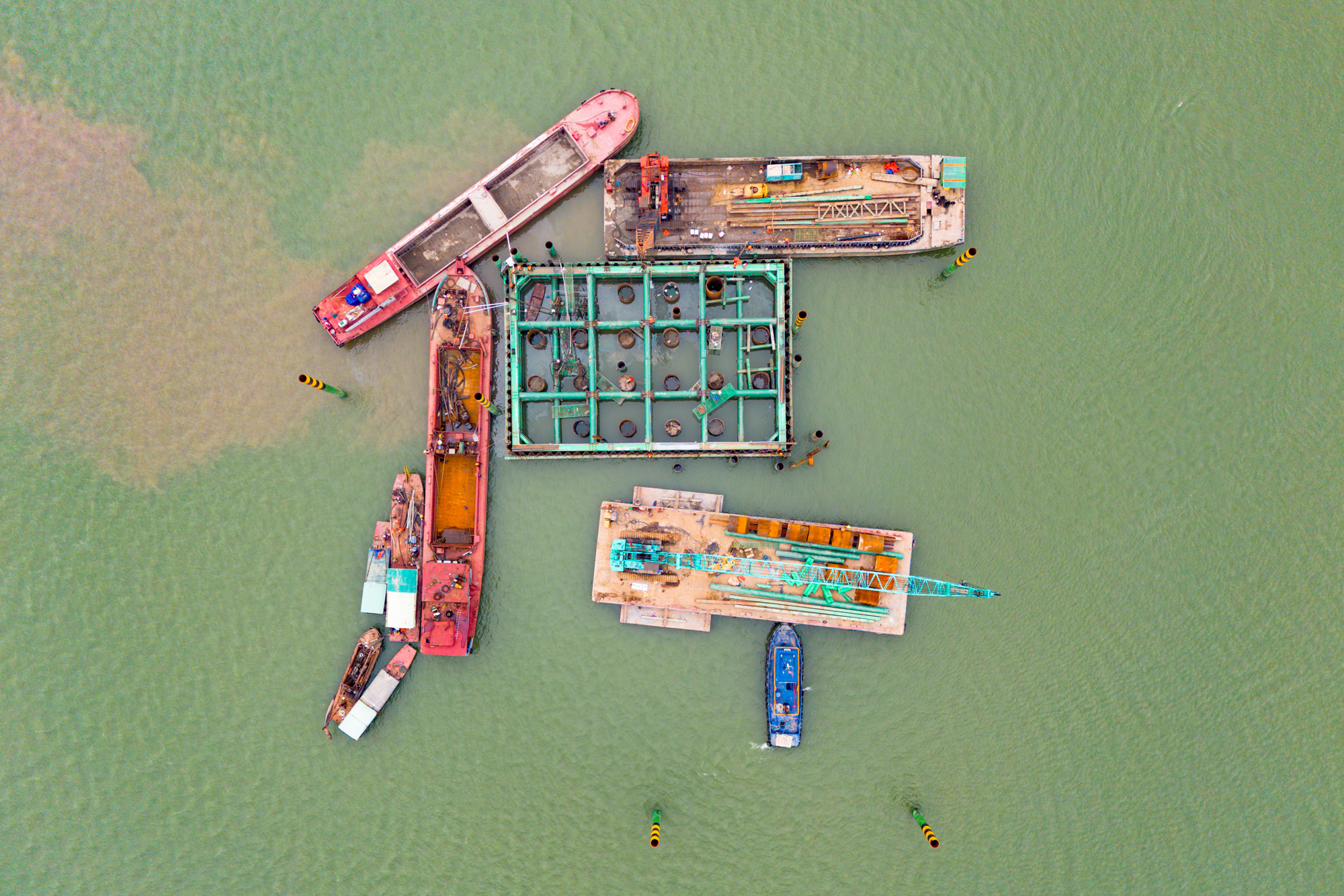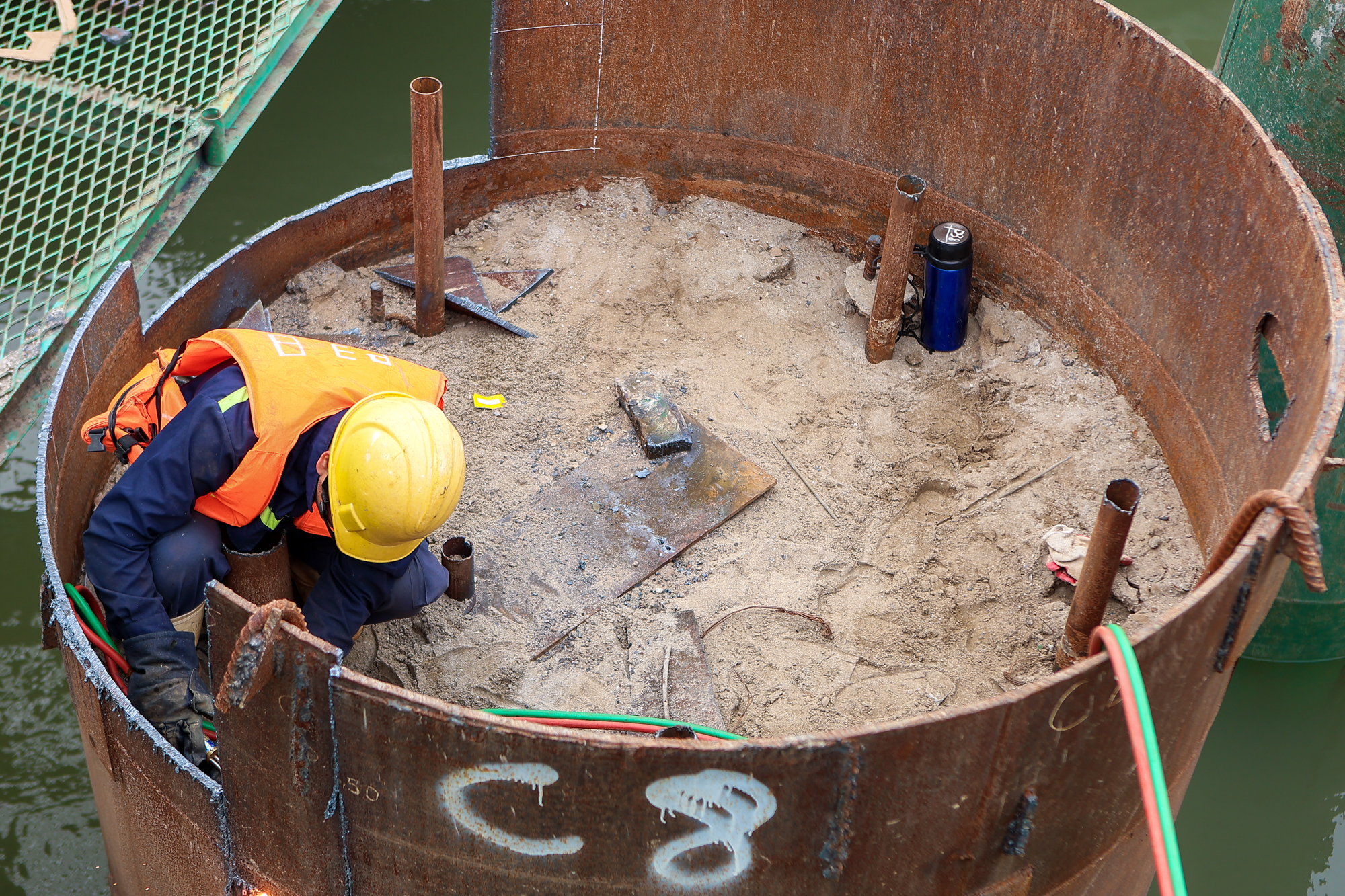 Chủ đầu tư đang huy động hơn 200 công nhân, 22 cần cẩu, 5 giàn khoan, 10 sà lan, tổ chức thi công 2 ca liên tục, phấn đấu hoàn thành chỉ trong 18 tháng.