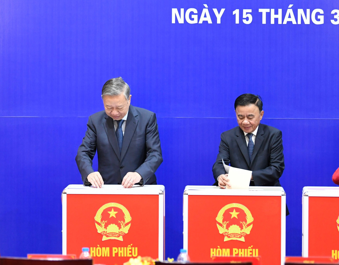 Tổng Bí thư Tô Lâm cùng các đồng chí lãnh đạo Đảng, Nhà nước bỏ phiếu bầu cử ngay sau phiên khai mạc.