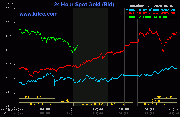 Tối 17/10 (giờ Việt Nam), giá vàng thế giới giao ngay ở ngưỡng 4.309 USD/ounce, giảm khoảng 76 USD so với đỉnh lịch sử 4.378,69 USD/ounce được thiết lập trước đó trong cùng ngày.