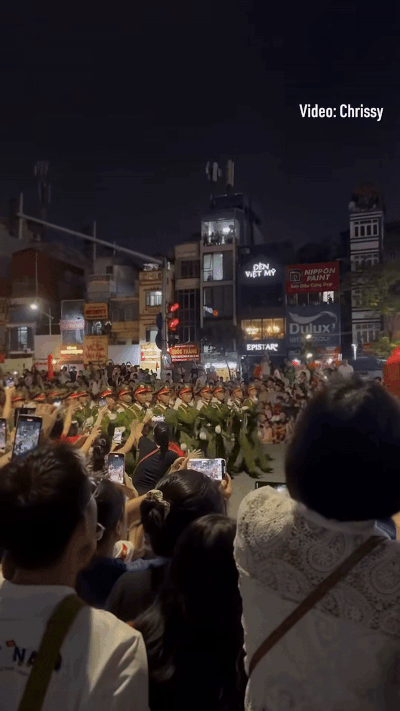 Đến 20h như đã định, các khối chiến sĩ lần lượt vào đội hình, tiến ra tuyến đường diễu binh. Chị gái đứng cạnh tôi vừa dõi theo các chiến sĩ vừa tuyên bố: “Hôm nay mình đứng đây để xem đội này, 24 mình đi đứng chỗ khác theo dõi đội khác, 29 mình lại đứng chỗ khác nữa. Nhất quyết không thể thiếu đội nào!”.