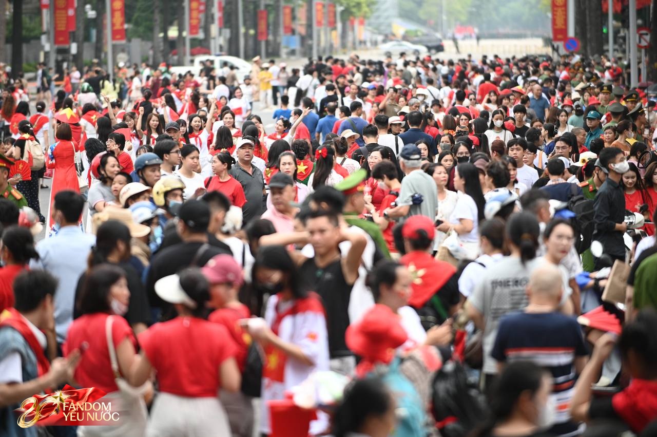 “Bọn em là bộ đội nghĩa vụ, thay nhau trực ở đây mấy ngày này. Chị uống nước chè không? Hay nước ngọt? Chị lấy giấy lau mồ hôi không? Bộ đội cái gì cũng có. Bọn em cũng vừa được các bạn đi qua đây tặng quà, có bạn từ TP.HCM ra chơi xong gửi đồ ở đây để đi chơi rồi. Nhiều người đến đây từ sáng lắm chị ạ. Có người đi chụp ảnh thôi xong về, nhưng chủ yếu mọi người ở lại chờ đến tối để xem diễu binh”, một chiến sĩ kể.