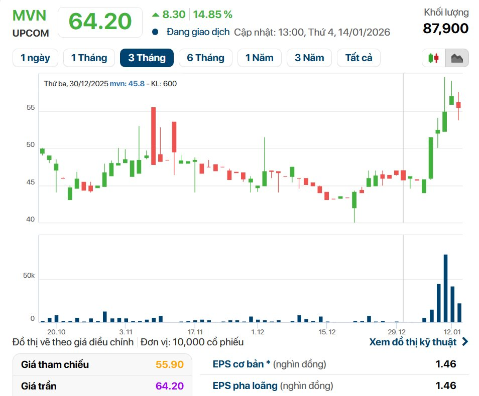 Thị trường chứng khoán phiên giao dịch ngày 14/1 ghi nhận cổ phiếu MVN của Tổng Công ty Hàng hải Việt Nam (VIMC) tăng trần lên mức 64.200 đồng/cổ phiếu, nâng vốn hóa thị trường đạt hơn 66.700 tỷ đồng.