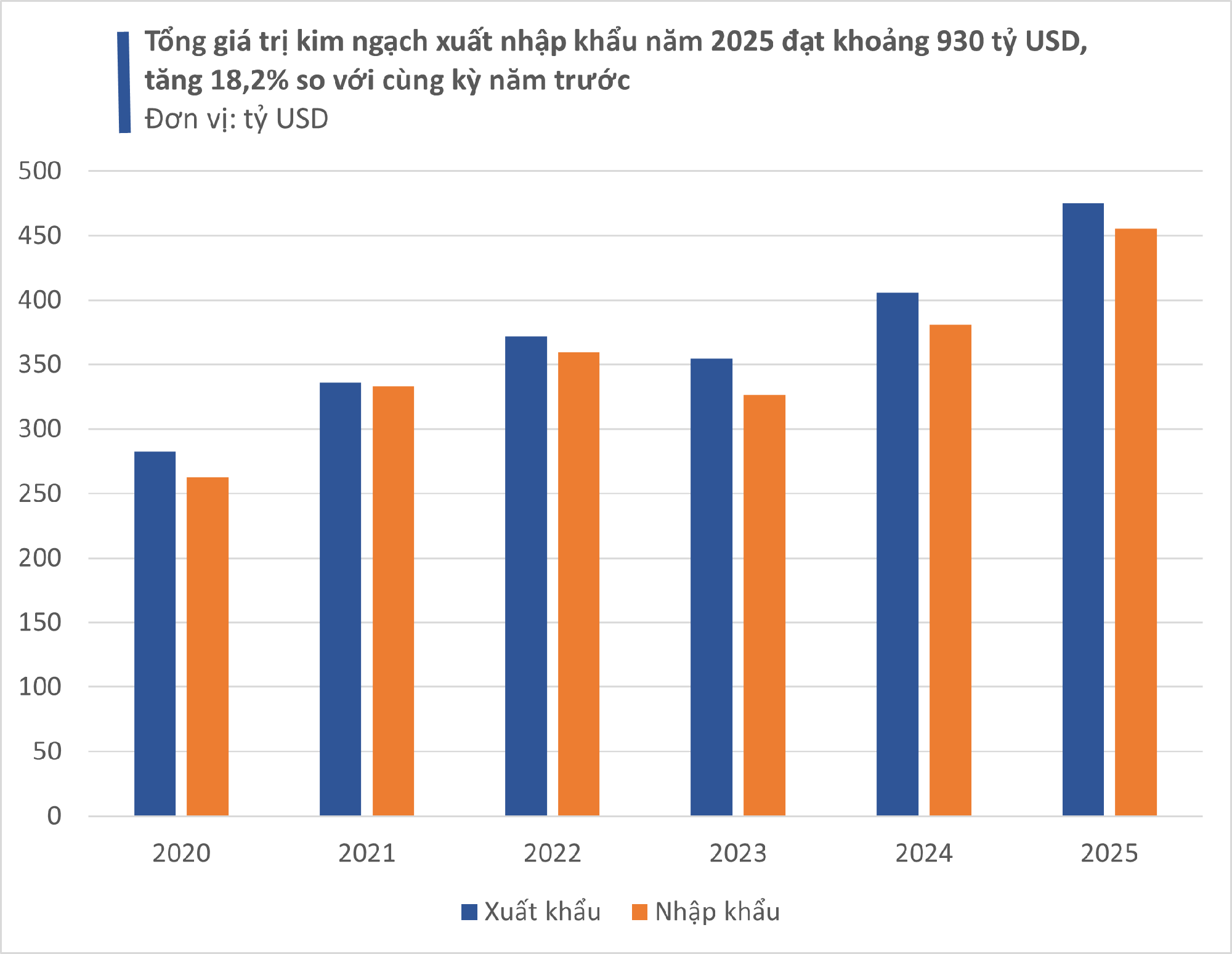Năm 2025 chứng kiến tổng giá trị kim ngạch xuất nhập khẩu đã đạt khoảng 930 tỷ USD, tăng 18,2%, tương ứng tăng thêm 143 tỷ USD so với năm trước. "Đây là tốc độ tăng trưởng vượt ngoài mong đợi của cá nhân tôi cũng như nhiều chuyên gia kinh tế,” ông nói. Từ nền tảng này, triển vọng năm 2026 được đánh giá tiếp tục tích cực. “Tôi tin rằng đà tăng trưởng mạnh mẽ này sẽ tiếp tục được duy trì trong năm 2026 và chúng ta hoàn toàn có cơ sở để cán mốc 1.000 tỷ USD vào năm tới.”