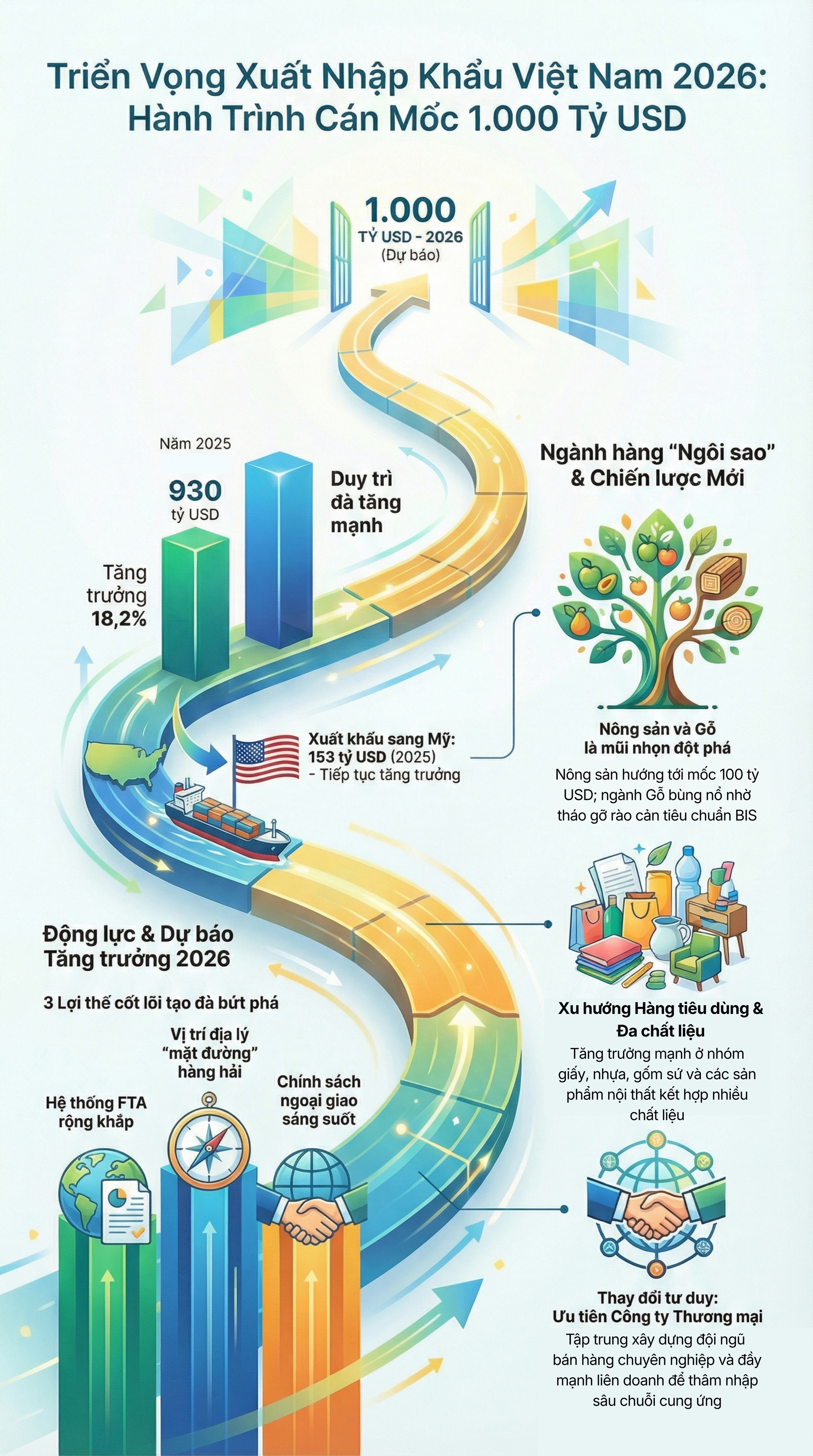 Sau khi thiết lập kỷ lục mới về quy mô thương mại, hoạt động xuất nhập khẩu của Việt Nam đang được dự báo sẽ tiếp tục duy trì đà tăng trưởng mạnh trong năm 2026, thậm chí tiến sát tới cột mốc mang tính biểu tượng 1.000 tỷ USD.