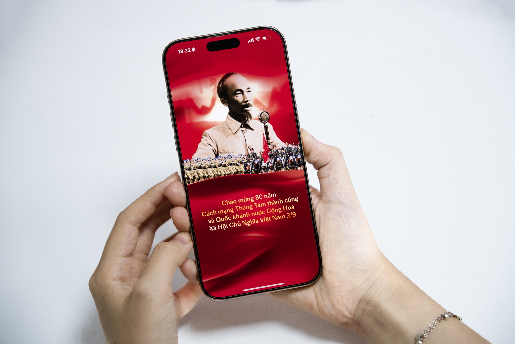 Ngay trên trang chủ lẫn giao diện ứng dụng điện thoại, hình ảnh Hồ Chủ tịch đọc Tuyên ngôn Độc lập và đội hình diễu binh tiến bước được đặt trang trọng, tạo cảm giác thiêng liêng.