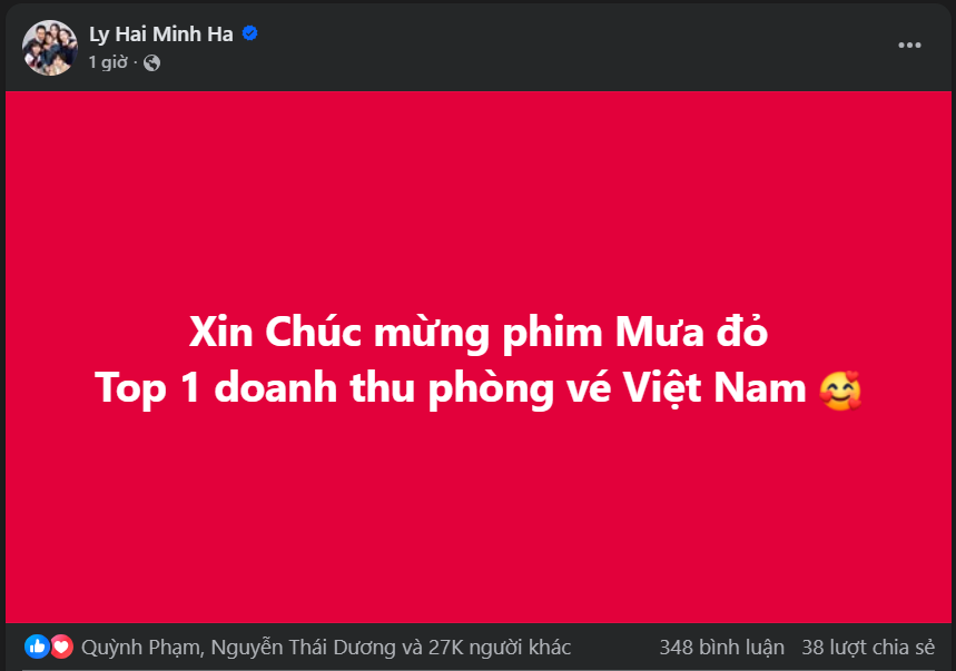 Không chỉ Trấn Thành, Lý Hải (Đạo diễn của Lật mặt 7) cũng đăng dòng trạng thái chúc mừng cho thành tích của “Mưa Đỏ”.