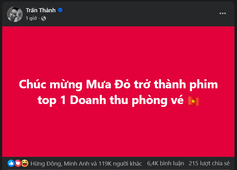 Trước thông tin này, Trấn Thành (đạo diễn của bộ phim Mai) đã đăng tải dòng chia sẻ chúc mừng trên trang cá nhân của mình. “Chúc mừng Mưa Đỏ trở thành phim top 1 Doanh thu phòng vé”, Trấn Thành viết.