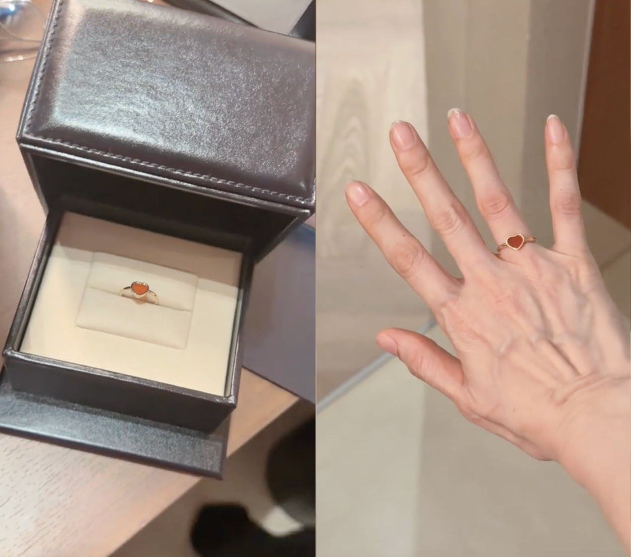 Món quà gây bão mạng xã hội chính là mẫu nhẫn My Happy Hearts đến từ thương hiệu đồng hồ và trang sức cao cấp Thụy Sĩ: Chopard. Happy Hearts collection là thiết kế mang tính biểu tượng được chế tác từ vàng hồng 18K, kết hợp với mặt đá Carnelian (Mã não đỏ) rực rỡ, lồng tinh tế trong khung hình trái tim.