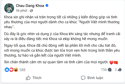 Ngày 28/4, nhạc sĩ Châu Đăng Khoa chính thức lên tiếng sau những tranh cãi xoay quanh ca khúc Người Việt mình thương nhau. Anh cho biết phiên bản ca từ ban đầu xuất phát từ góc nhìn và dụng ý cá nhân trong quá trình sáng tác. Tuy nhiên, việc bài hát tạo ra những ý kiến trái chiều là điều anh và ê-kíp không mong muốn.